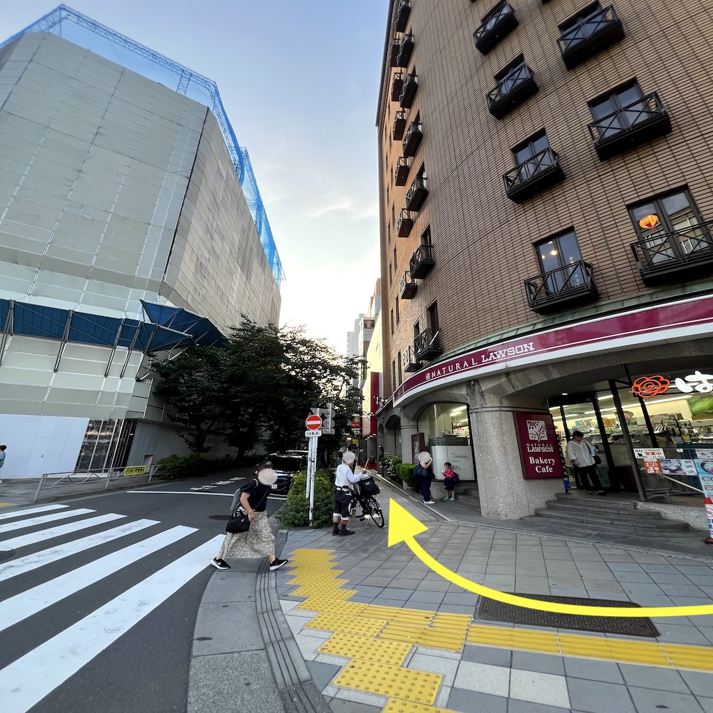 2.交差点を渡り、ナチュラルローソンのあるビルまで進みます。(JR五反田駅西口から、このビルまで100mほどの距離です。)